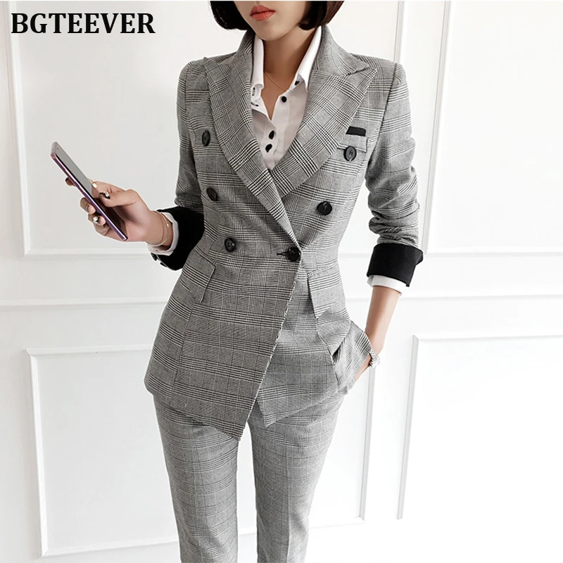 SALE Vintage Plaid Double-breasted Women Blazer Suit Set Slim Women Pant Suits Female Workwear Trouser S